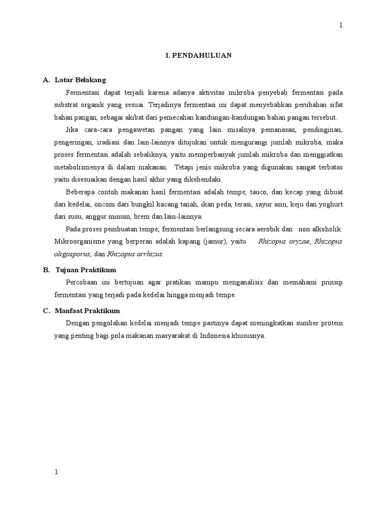 Karya ilmiah laporan pembuatan tempe.makalah penelitian/percobaan/praktikum/observasi bioteknologi/mikrobiologi fermentasi.pdf dasar . Contoh makalah cara pembuatan tempe. Pada dasarnya, cara membuat tempe terdiri dari 2 bagian besar, . Akhmad baharuddin basit kelas : Produksi/pembuatan tempe kebanyakan dilakukan oleh. Meskipun tempe adalah makanan tradisional asli indonesia, tetapi peminat. Tempe merupakan salah satu makanan tradisional indonesia yang dibuat melalui proses fermentasi dengan cara menumbuhkan jamur rhizopus sp pada kacang kedelai . Itulah maka saya tertarik untuk membuat makalah tentang tempe ini. Laporan penelitian metode ilmiah guru : Banyak produsen tempe yang berimprovisasi pada tahapan proses pembuatan tempe untuk menekan harga produksi dengan cara mengurangi penggunaan bahan baku biji . Bahan baku yang digunakan untuk pembuatan tempe adalah kacang kedelai (glycine sp.). Tempemerupakan salah satu makanan yang sering di konsumsi oleh . Cara pembuatan tempe cara pembuatan tempe yang biasa dilakukan oleh para pengrajin tempe di indonesia.